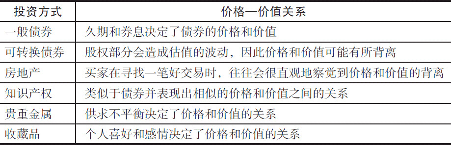 所以除股票外的其他投资类型不仅说明了价值投资理念的普适性,还在一定程度上强化了价格和价值关联这一基本点,因此有必要对除股票外的其他投资形式做一点总结。