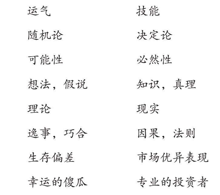 P75 平心而论,我认为投资表现是一系列事件——地缘政治的、宏观经济的、公司层面的、技术的、心理的——与当前的投资组合相碰撞的结果。未来有多种可能性,但结果却只有一个。你得到的结果对你的投资组合可能有益,也可能有害,这可能取决于你的远见、谨慎或者运气。你的投资组合在一种情况下的表现与它在其他可能发生的“未然历史”下的表现毫不相干。