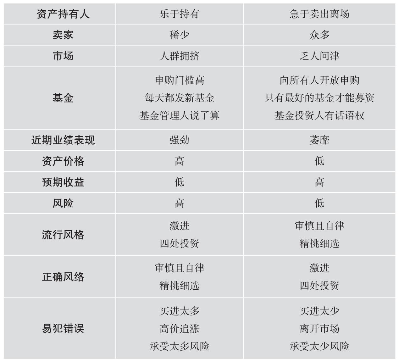 我们不可能知道过热的市场将何时冷却,也不可能知道市场将何时止跌上涨。不过,虽然我们不知道将去向哪里,但我们应该知道自己身处何方。我们可以通过周边人的行为推知市场处在周期中的哪个阶段。当其他投资者无忧无虑时,我们应小心翼翼;当其他投资者恐慌时,我们应变得更加积极。