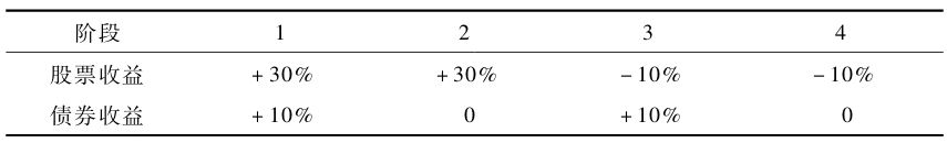 P53 例3-1 这个模型仅由两种资产组成:第一种是与弗雷德叔叔投掷硬币的收益率分布相同的资产。它会以相等的概率带来+30%或-10%的收益率,在这个例子中我们称之为股票;第二种资产会以相等的概率带来0%或+10%的收益率,我们称之为债券。这里所说的股票长期收益和风险与真正的股票很相似,债券的长期收益和风险也和5年期国债相似。这个组合的收益有四种可能的结果: