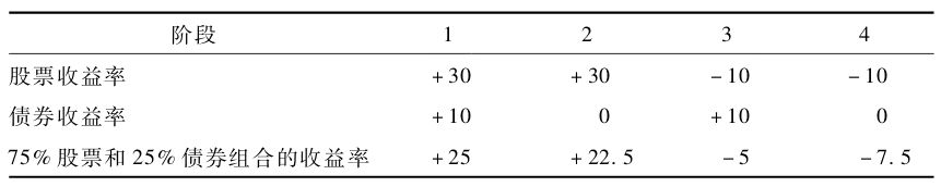 因此,如果某一时期股票的收益率为+30%,债券的收益率为+10%,那么投资组合的收益率是:(0.25×10)+(0.75×30)=25%