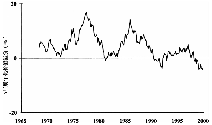 ###图7-5 画出了5年期年化规模溢价###过去36年中的“规模溢价”(用纽交所中市值排在后50%的上市公司收益率减去前50%的公司收益率)是1.71%。我在图7-5中画出了该溢价的走势,它的5年期滚动收益只有53%的时间为正。