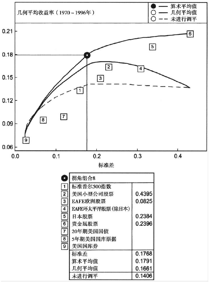 P185 多大的调平区间可以产生最大的调平红利?答案很复杂,但基本围绕于一点上,即找到这样一个调平区间,使投资组合中各资产的相关性最低,并且年化方差最高。换句话说,在给定的时间段中,当你选择的收益率数据的区间不同时,比如每天、每周、每月、每季度、每年等,对应资产的方差和相关系数都会不同。使资产拥有最低相关性和最高方差的收益率区间就是最优的调平区间。我见过几种相似的投资组合最优调平区间,它们从最短的一个月到最长的数年之久。对于给定的投资组合,我们可能无法提前预测其最优调平区间,但一般的规律是,较长的调平区间会更好一些。这是源于我们在第7章中说过的趋势效应。如果你对调平的理解有困难,不用难过。这是一个非常复杂的领域,甚至连最老练的投资者也经常会对这些概念产生误解。思考调平区间问题最简单的方法就是考虑只包含美国和日本股票的组合。由于过去几十年中美国股票价格几乎直线上升,而日本股票价格几乎直线下跌,尽可能不调平(比如每10年调平一次)要比频繁调平更好。不过即使你每一两年就调平一次,你也不会损失得太多。