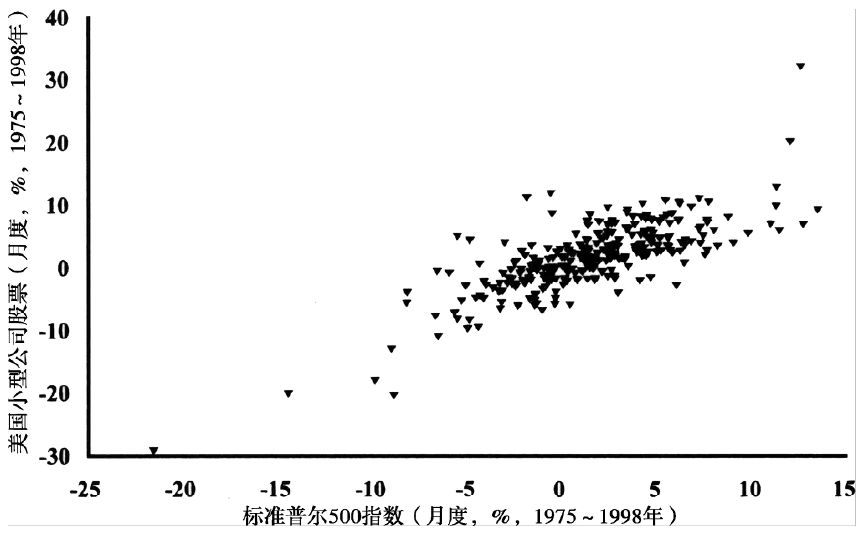 画出了从1975年1月到1998年12月的24年中两种资产总共288个月的月收益。图中每一个点都表示两种资产某一个月的收益,x轴(横轴)和y轴(纵轴)分别代表其中一种资产的收益率。如果这两种资产是完全相关的,那所有点都会落在一条直线上。(如果相关系数为正,那所有点会组成一条从左下向右上延伸的曲线;如果相关系数为负,那所有点会组成一条从左上向右下延伸的曲线。)如果两种资产不相关,那这些点将会分散在整个图上。