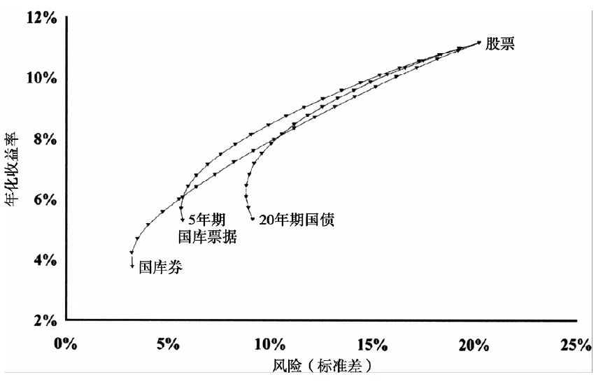 P59 ###图4-1描述了不同比例的股票与20年期国债组合在1926~1998的收益率均值和标准差### 向纯债券组合中增加15%的股票完全没有增大风险,但收益却上升了。在我们越过50/50的点时,想组合中继续加入股票只会略微增加收益,但风险却大大增加。曲线向上凸出和向左凸出说明分散投资可获取超额收益。